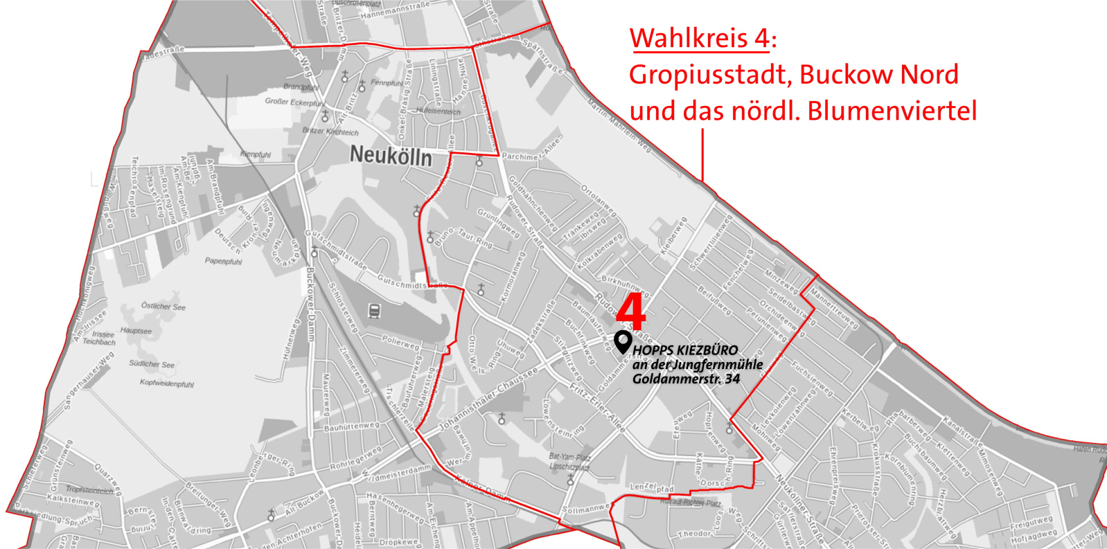 Das Bezirksamt von Neukölln hat gemäß des Senatsbeschlusses die Wahlkreise neu zugeschnitten. Die Gropiusstadt, Buckow Nord und das nördliche Blumenviertel bilden nun den Wahlkreis 4 (siehe Abbildung).